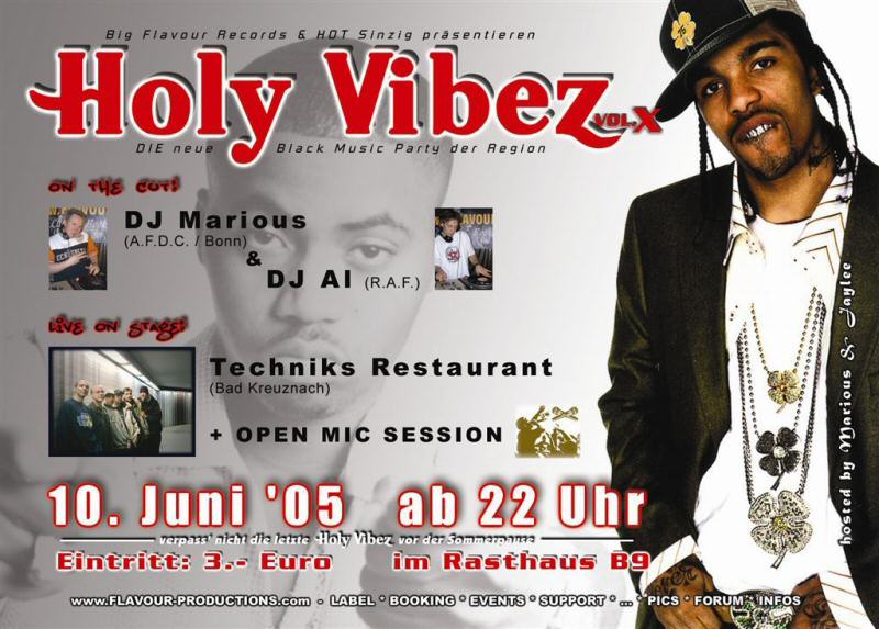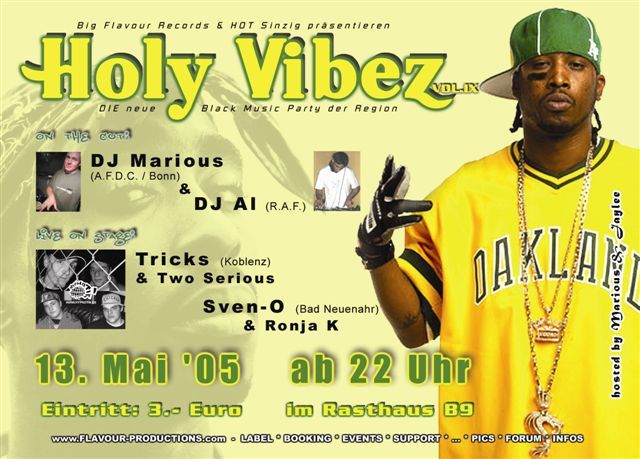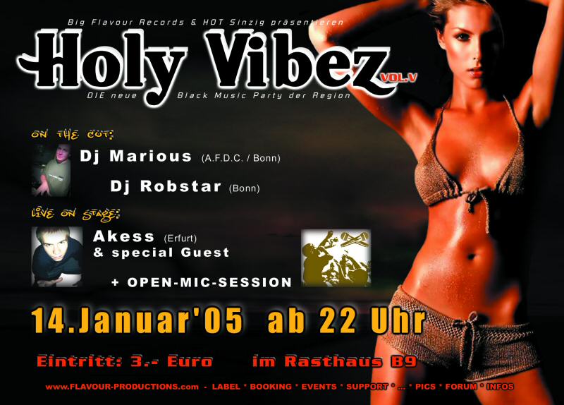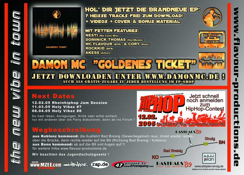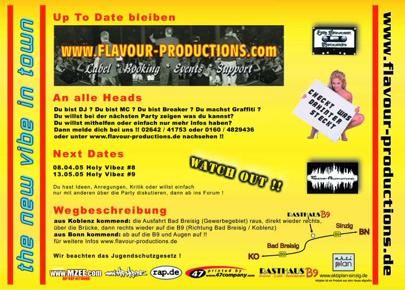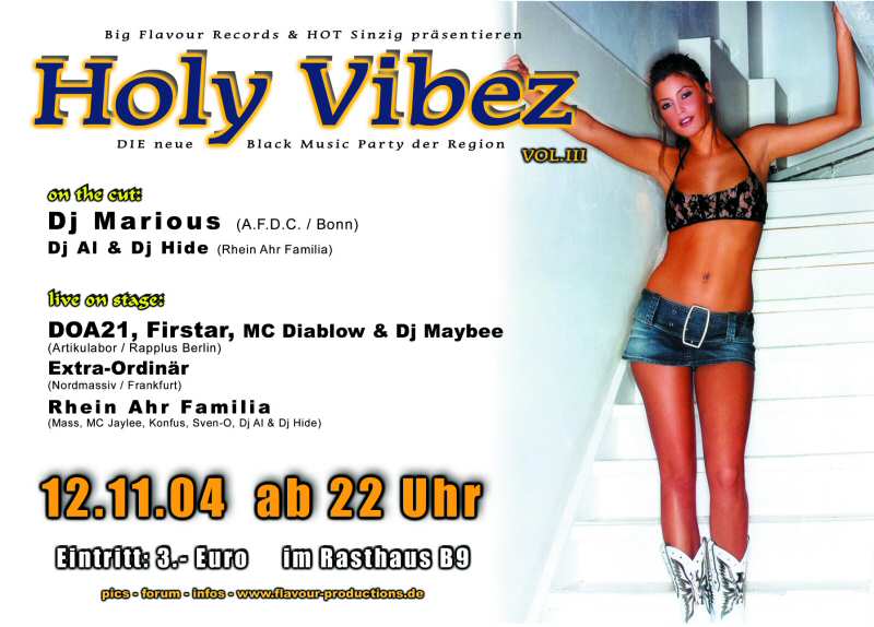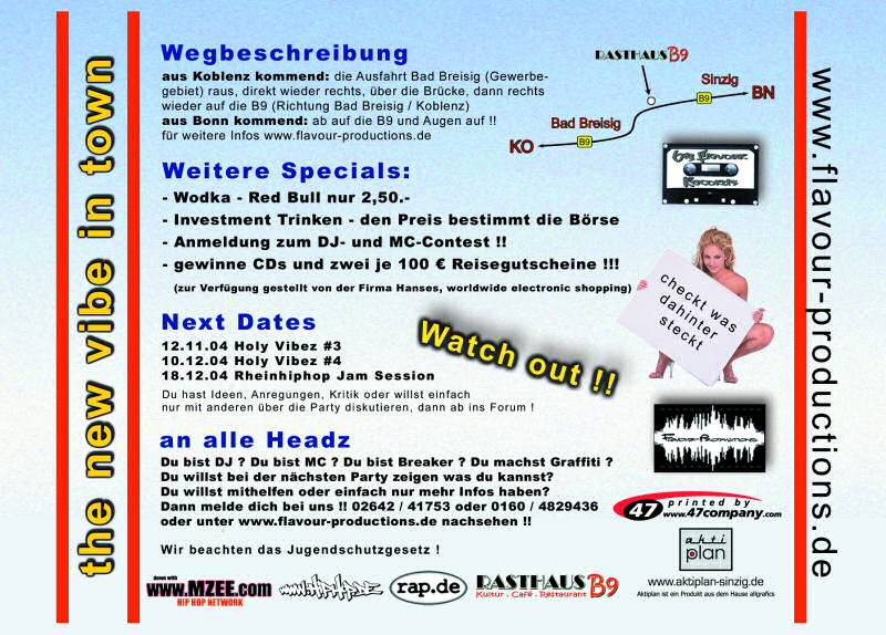 ab 22 Uhr, Eintritt 3 Euro on the cut: DJ Marious (A.F.D.C. / Bonn) Doc Beckster (Bad Neuenahr) live on stage: MC FLAVOUR, DAMON MC & ROCKKID (Big Flavour Records) Esco & Mackne$$ (Viruz Crew 2004) |