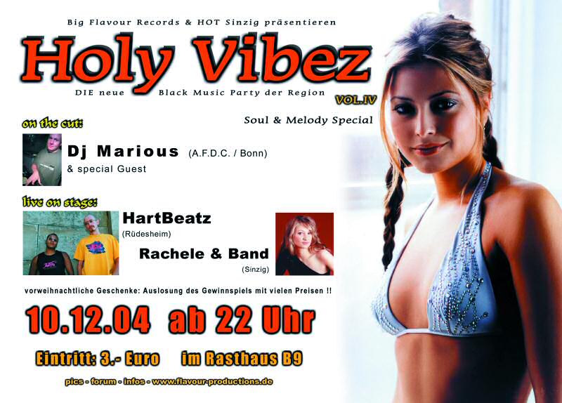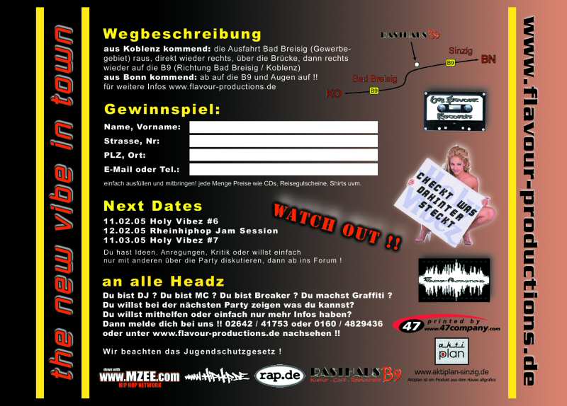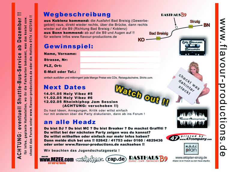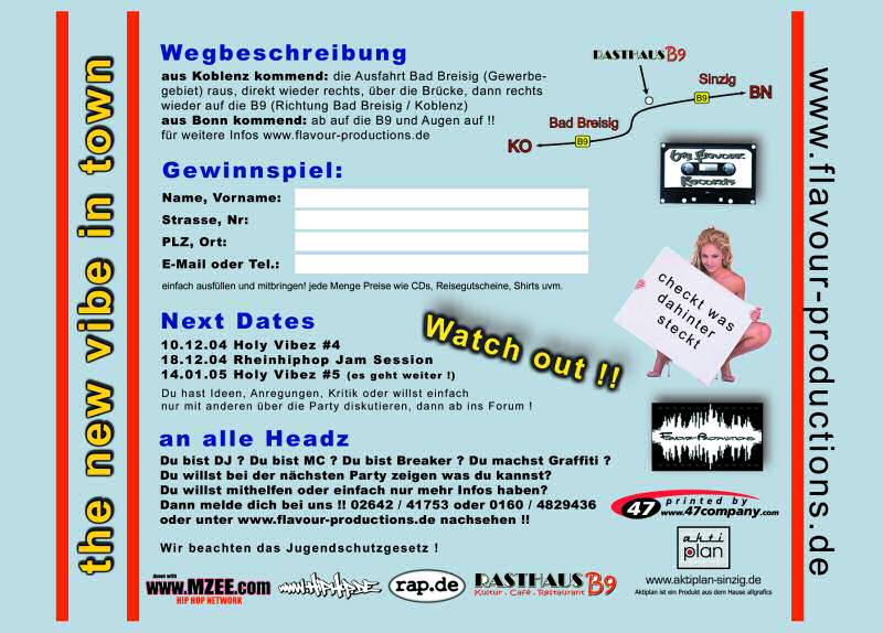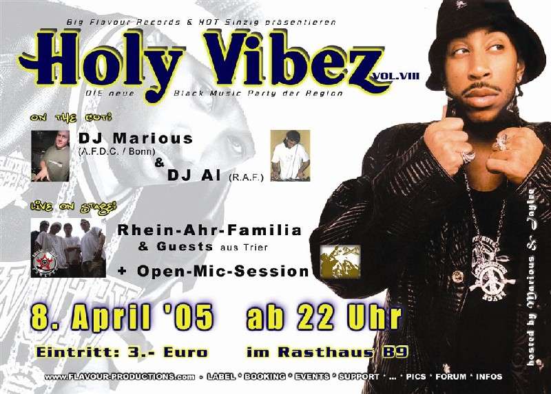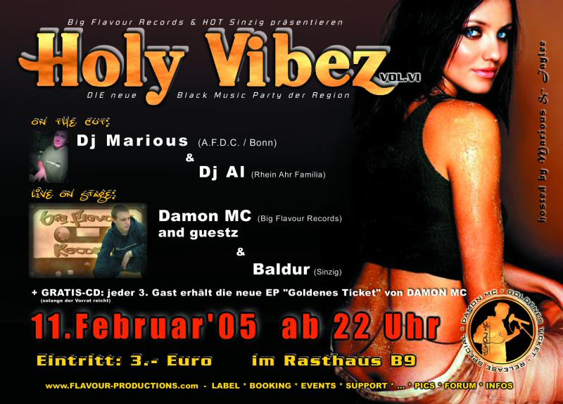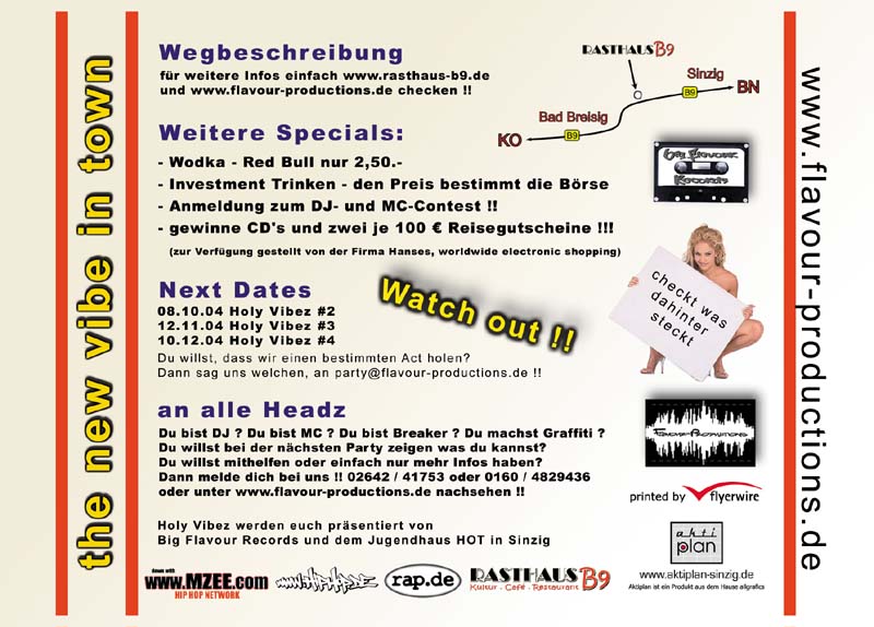 ab 22 Uhr, Eintritt 3 Euro on the cut: DJ Marious (A.F.D.C. / Bonn) Doc Beckster (Bad Neuenahr) live on stage: MC FLAVOUR, DAMON MC & ROCKKID (Big Flavour Records) Esco & Mackne$$ (Viruz Crew 2004) |