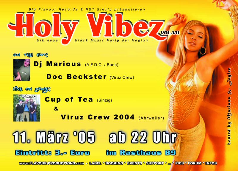 ab 22 Uhr, Eintritt 3 Euro on the cut: DJ Marious (A.F.D.C. / Bonn) DJ Doc Beckster (Viruz Crew) live on stage: Viruz Crew (Ahrweiler) Cup of Tea (Sinzig) |